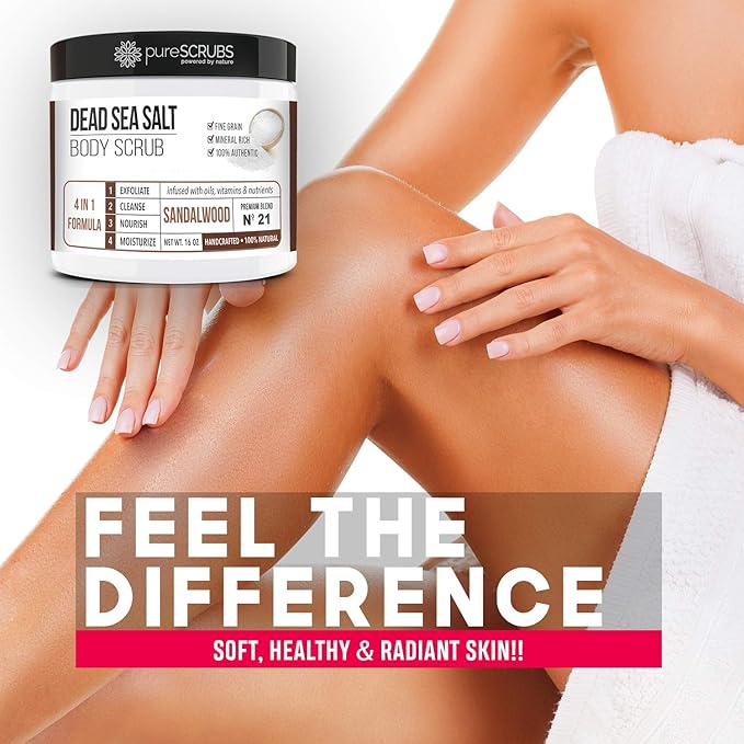 - GET ULTRA SMOOTH SKIN FAST - THIS WORKS! Our unique “4 in 1 Formula” does everything a body scrub should do and more - EXFOLIATE, CLEANSE, NOURISH & MOISTURIZE. Fine grain dead sea salt infused with essential oils, nutrients and skin softeners helps to smooth away rough, bumpy, and uneven textures to instantly reveal your true soft, healthy and radiant skin. You'll love the sandalwood aroma!