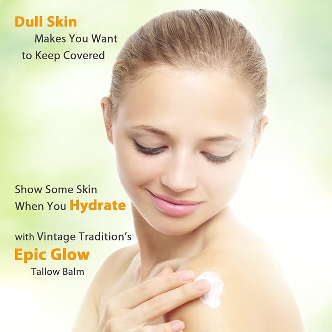 - Dispel Drab Skin – Put an end to dull, dry skin. Rub in radiance with Vintage Tradition’s Tallow Epic Glow with restorative essential oils and deeply hydrating tallow grass fed balm.