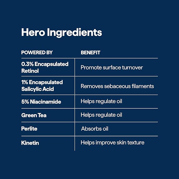 - [6 Powerful and Proven Actives] Features 0.3% Encapsulated Retinol, 1% Encapsulated Salicylic Acid, 5% Niacinamide, Green Tea, Perlite, and Kinetin.