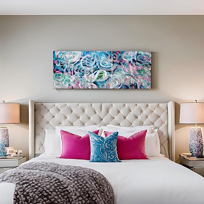 - Dynamic Swirl Design & Metallic Finish: 24inch in width and 64inch in length,including 1inch spacing between metal panels.This polished metal art features elegant white swirl patterns set against a vibrant blue and pink background, creating a mesmerizing 3D effect. The fluid lines add movement and sophistication, perfect for adding a modern touch to any space.