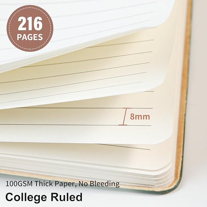 - 【216 Pages Of High Quality Paper】 Use 216 pages (108 sheets) of high quality 100Gsm acid-free paper thick lined paper with 8mm line spacing and light ivory color, our journal paper is thicker than normal notebooks, so you can use most pens, pencils and markers with confidence without ghosting and bleeding.
