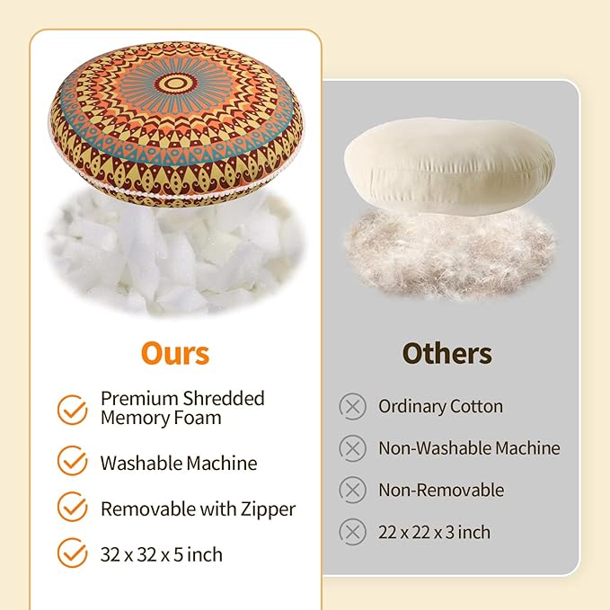 - Giant Floor Pillow: LOVMOC floor cushion is 32 inches in diameter, large enough for adults to sitting with crossed legs to meditate.