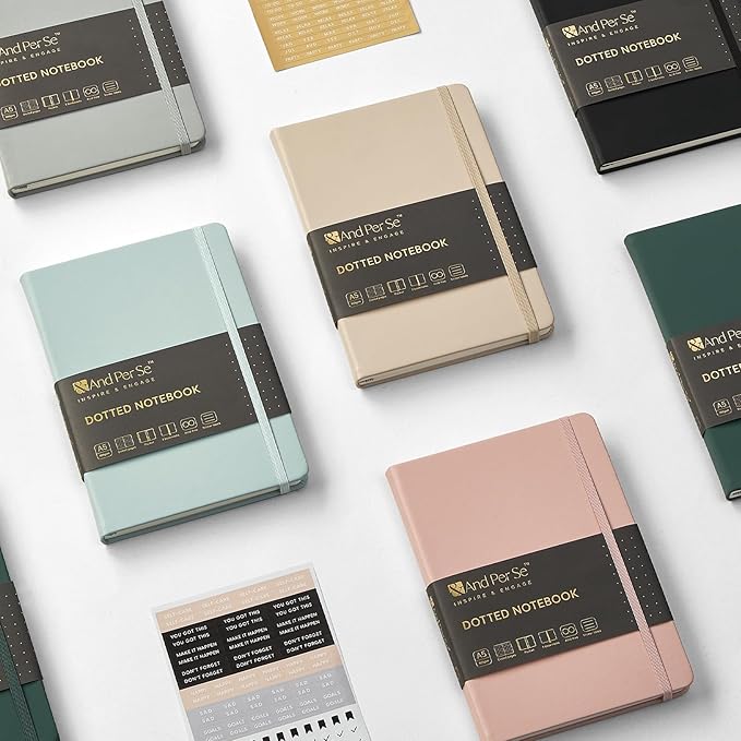 &And Per Se Dotted Journal Notebook (5 Packs), A5 Hardcover Leather Dotted Journal, 160 Pages 100 gsm Thick Paper, 3 Sheets of Stickers Included- 5.7'' x 8'' (Light Apricot