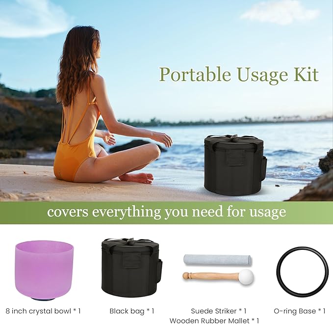 - Included Items: This set includes 1 purple crystal singing bowl, this crystal sound bowl tuned to the 432Hz frequency known for meditation.The bowls cover a Crown Chakra-adapted tones suitable for a variety of sound healing and meditation practices. The set meditation accessories includes 1 suede mallet, 1 rubber mallet and 1 rubber o-ring.