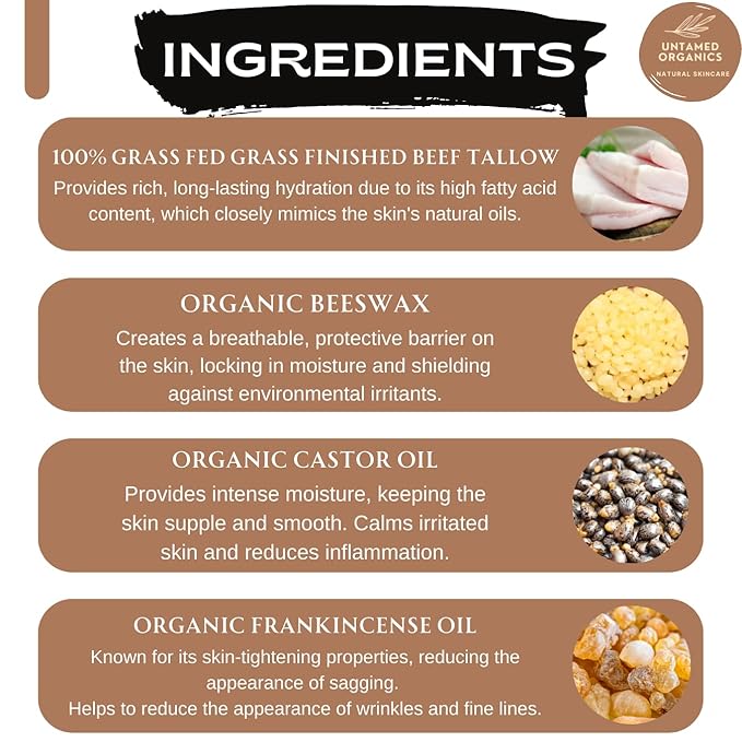 - PURE & NATURAL: Handcrafted from 100% grass-fed beef tallow, organic castor oil, organic raw beeswax, and pure frankincense essential oil for a luxurious and effective skincare solution.