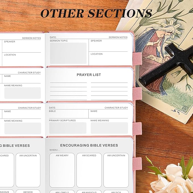 - Sermon Notes, Verse Study & Character Exploration Divided into Three Sections: sermon notes, verse analysis, and character studies. Also includes a prayer list and favorite verses section for personal reflection.