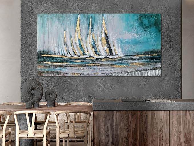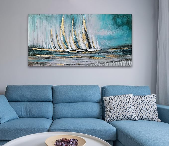 Anolyfi Blue Abstract Canvas Wall Art Teal Ocean Sailboat Picture Modern Coastal Nautical Painting, Textured Artwork Large Framed for Living Room Bedroom Bathroom Kitchen Office Home Decor 58"x29"