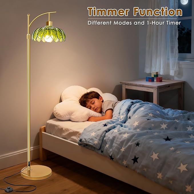 - Brightness Dimmable & 3 Color Modes: The gold floor lamp comes with LED bulb, which supports stepless brightness (1%-100%) and 3 color temperatures (3000K-6000K). With the remote control, you can eaily switch between 4 lighting modes (read, nursery, work and night light ) to meet your various scene needs. The timing function allows you to turn it on and off automatically at a scheduled time, while the memory function can help you remember the last setting